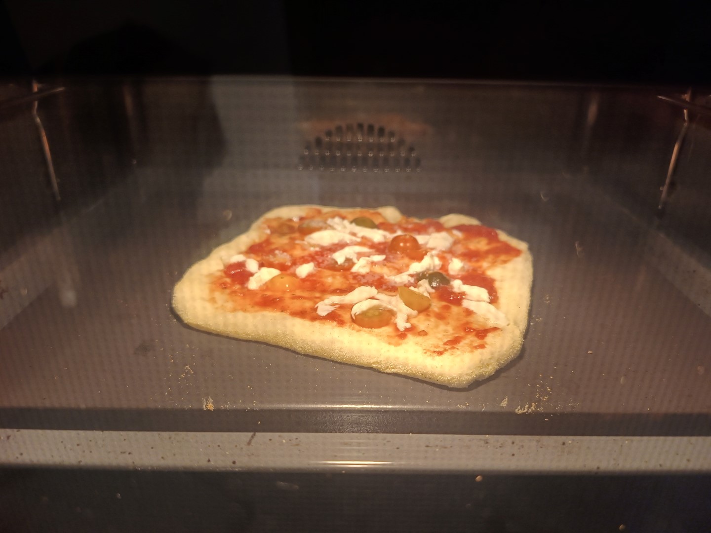 - Pizza auf Schieber ziehen und zügig im Backofen backen