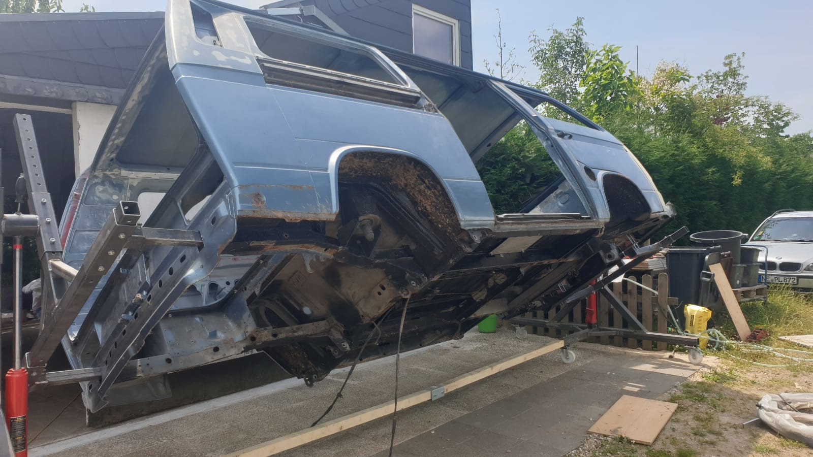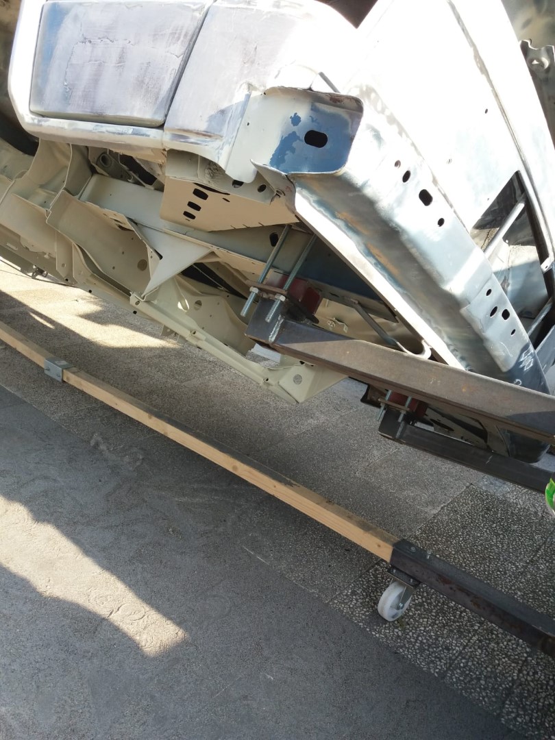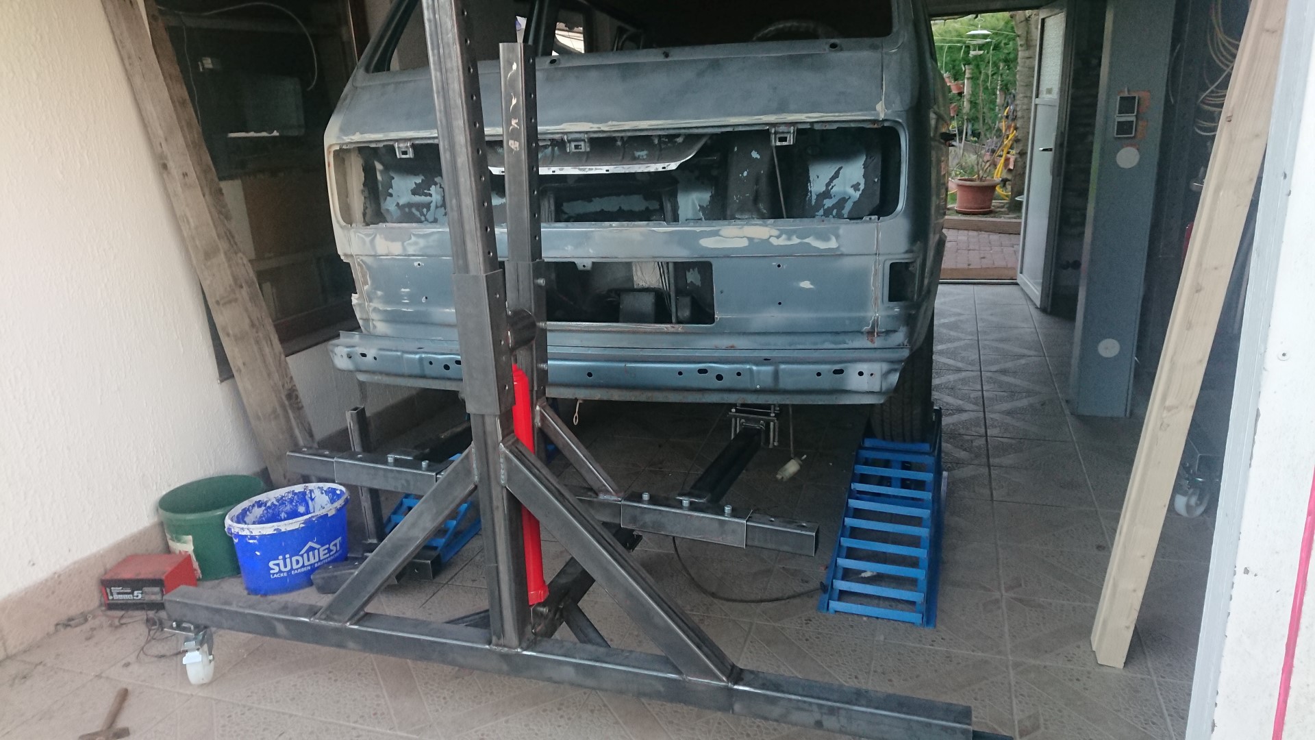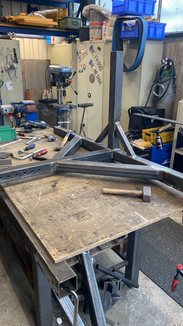 Wir wollen die „Karosse“ bis auf die letzte Schraube zerlegen und konstruieren hierfür ein Drehgestell, damit wir auch das Fahrwerk ausbauen können und besser unter dem Fahrzeug arbeiten können.