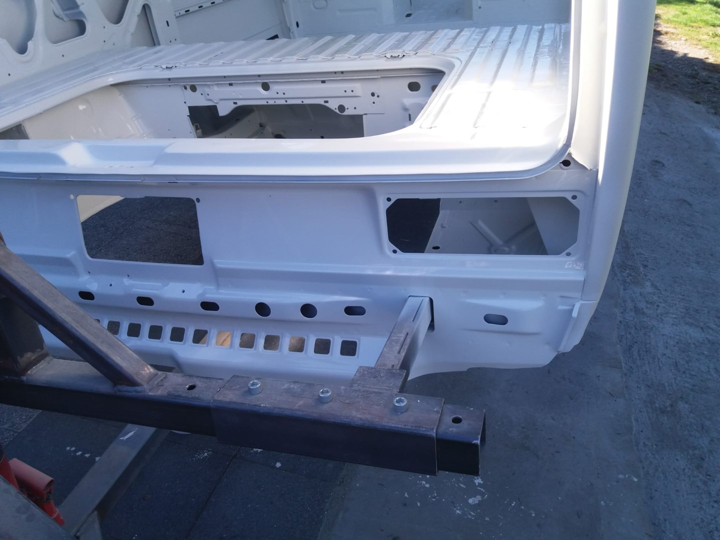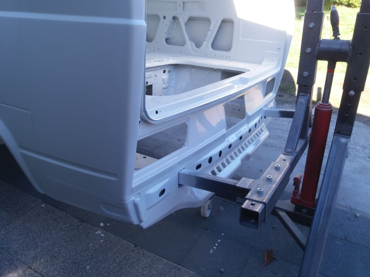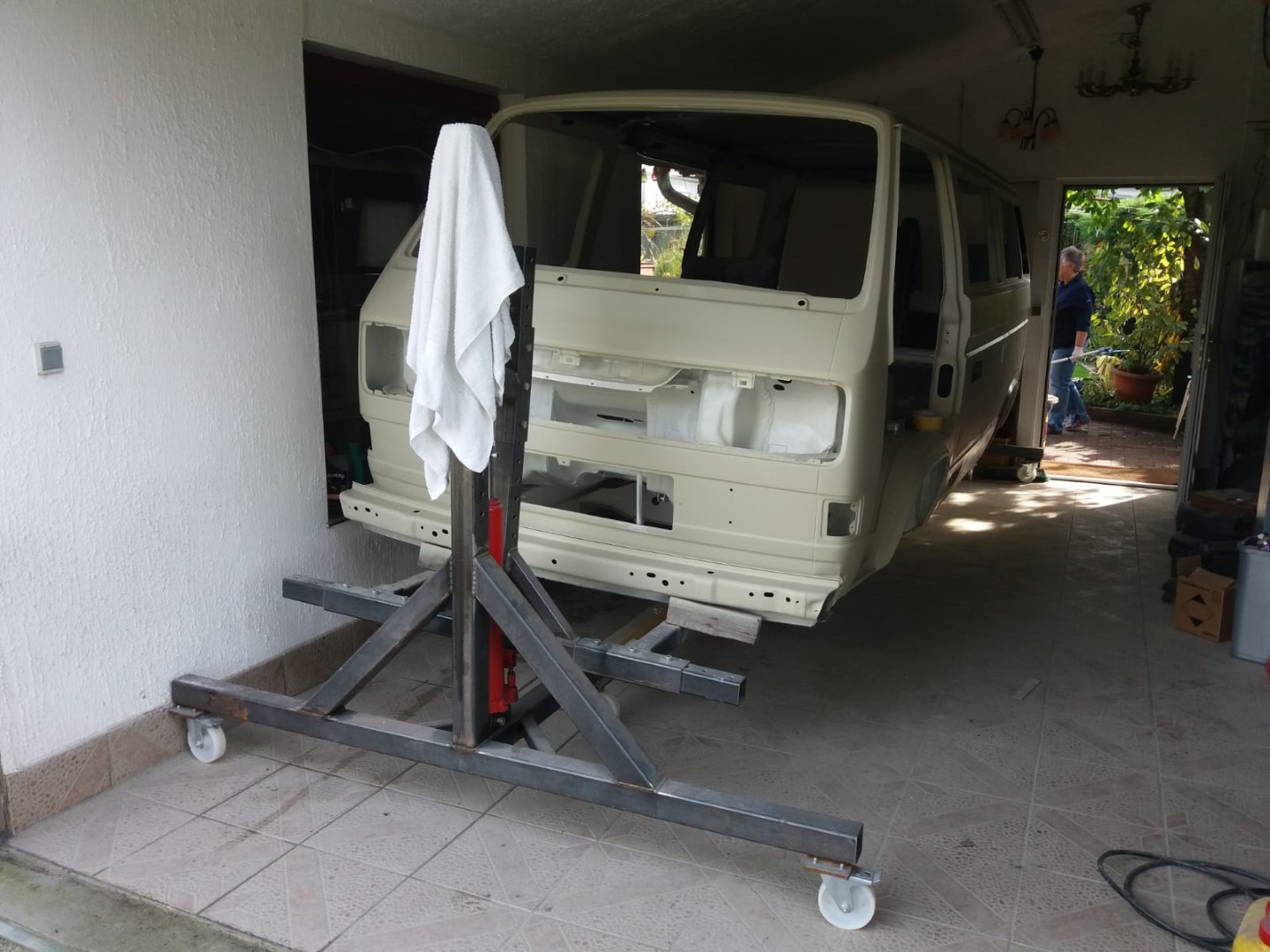 Wir wollen die „Karosse“ bis auf die letzte Schraube zerlegen und konstruieren hierfür ein Drehgestell, damit wir auch das Fahrwerk ausbauen können und besser unter dem Fahrzeug arbeiten können.