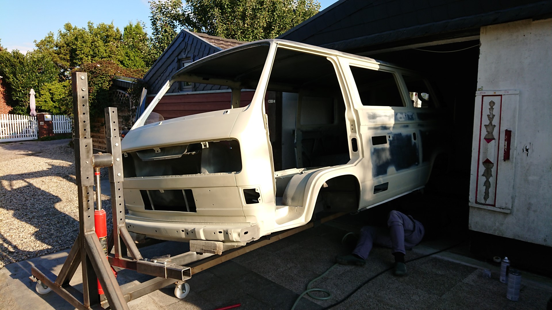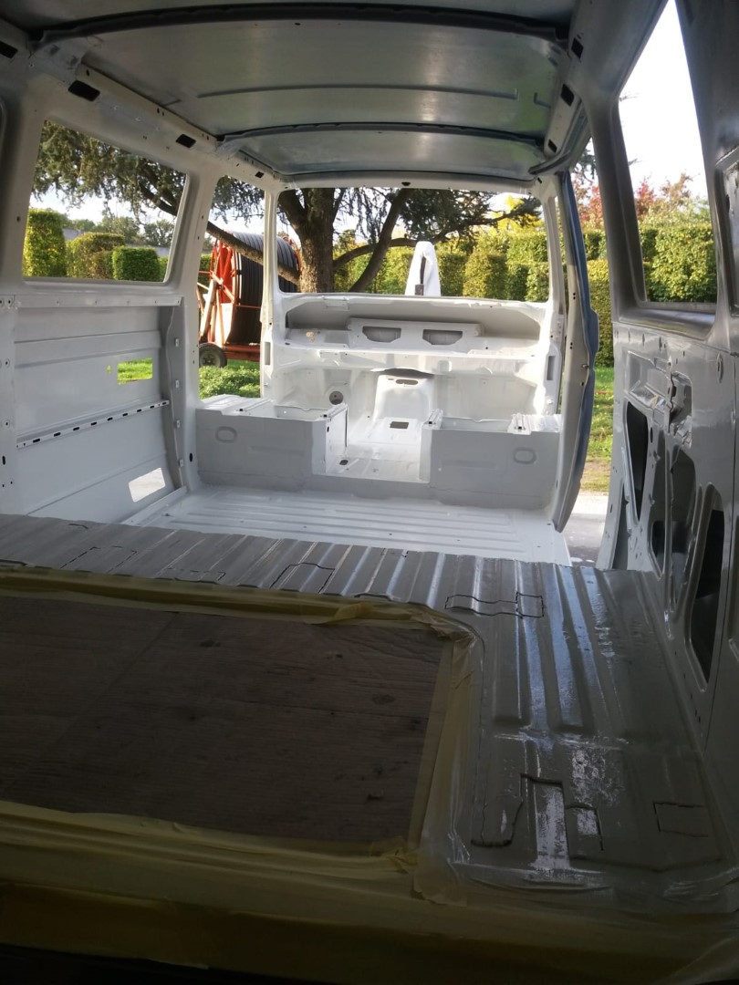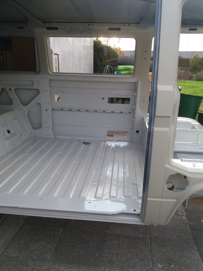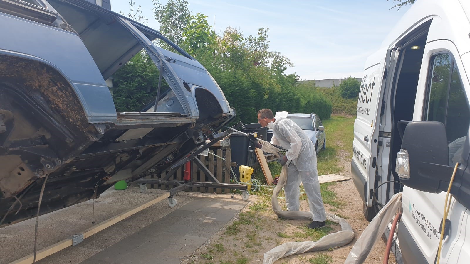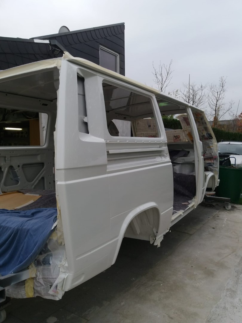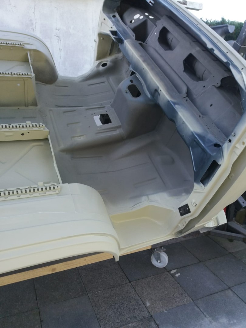 Nach dem unsere Karosse vollständig ausgezogen wurde, soll der Unterboden mit Trockeneis gereinigt werden und der Rost vollkommen verschwinden. Anschließend beginnt der neue Lackaufbau. Mit Blick auf unser Budget wird es wohl keine perfekte Lackierung und wir entscheiden uns soviel wie möglich selbst machen.