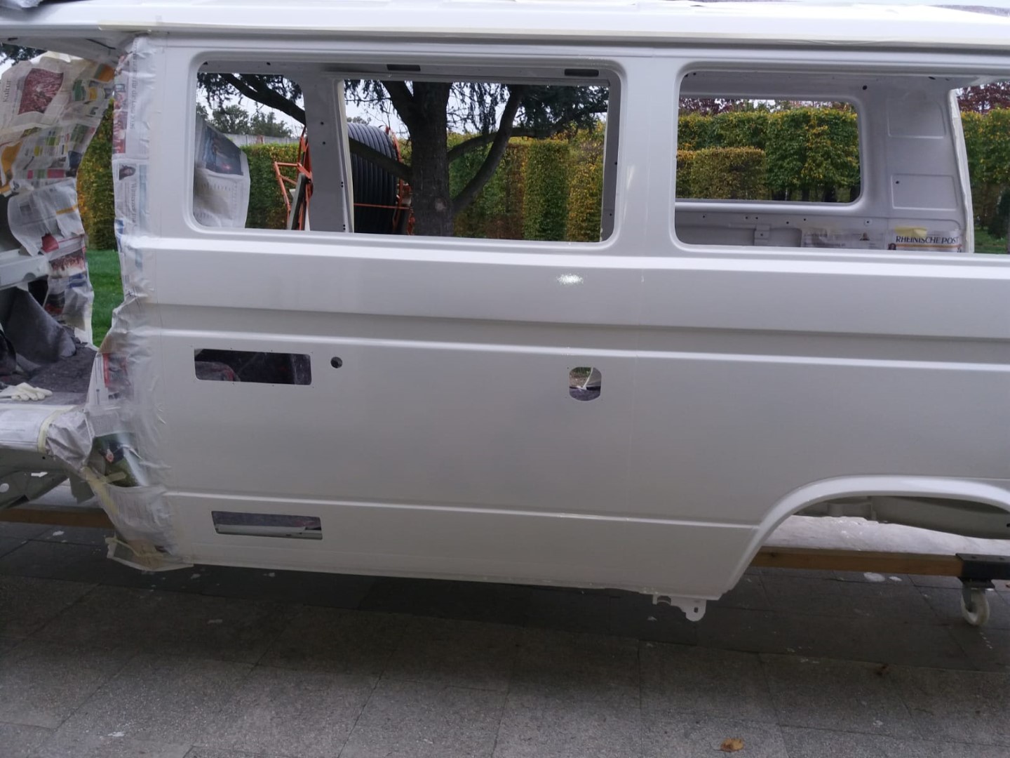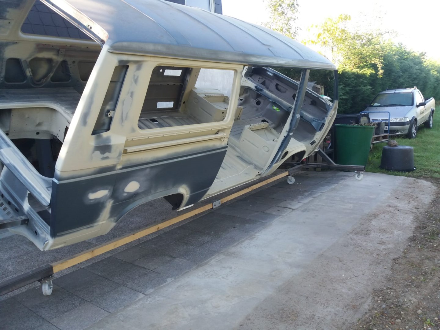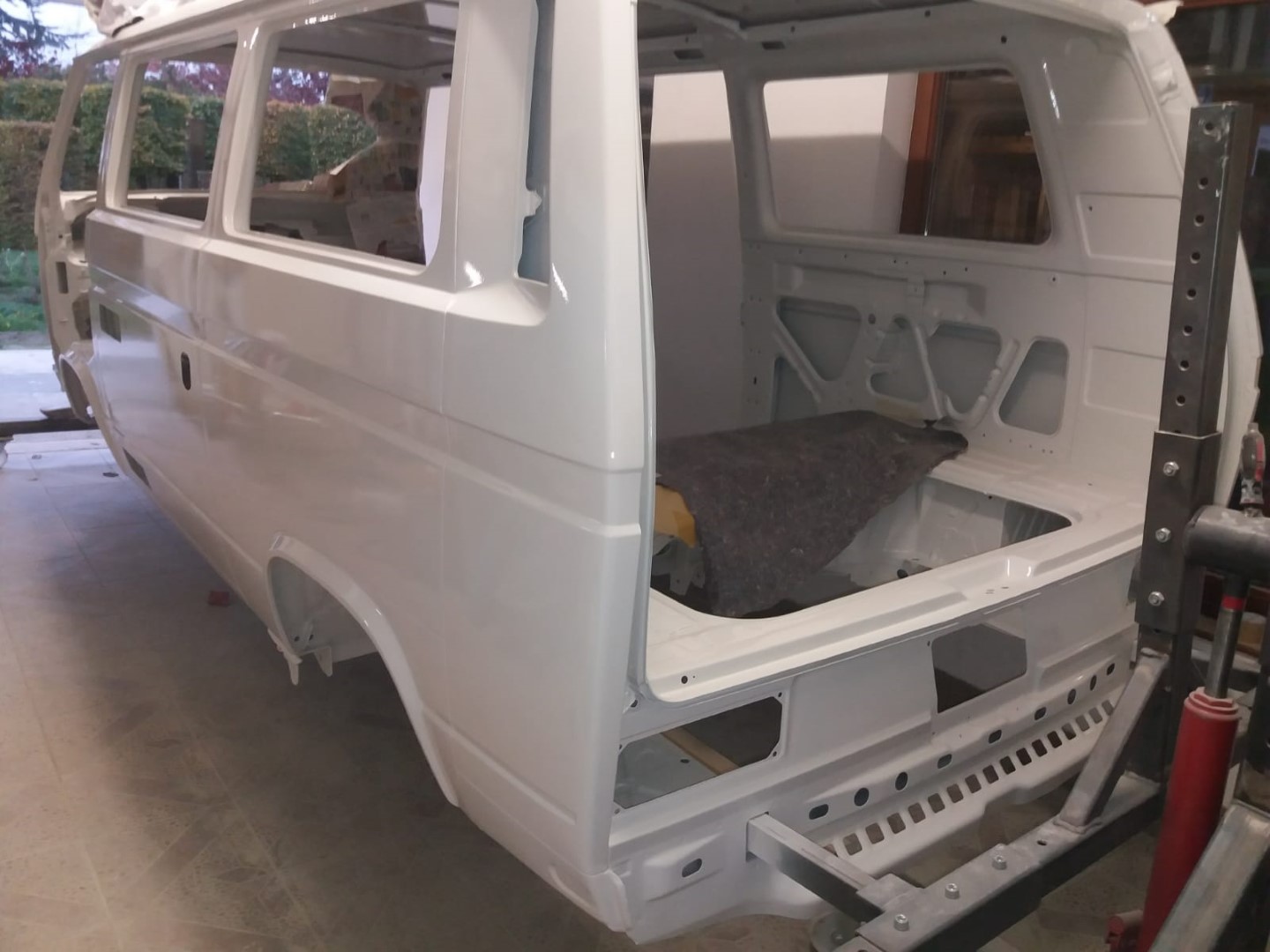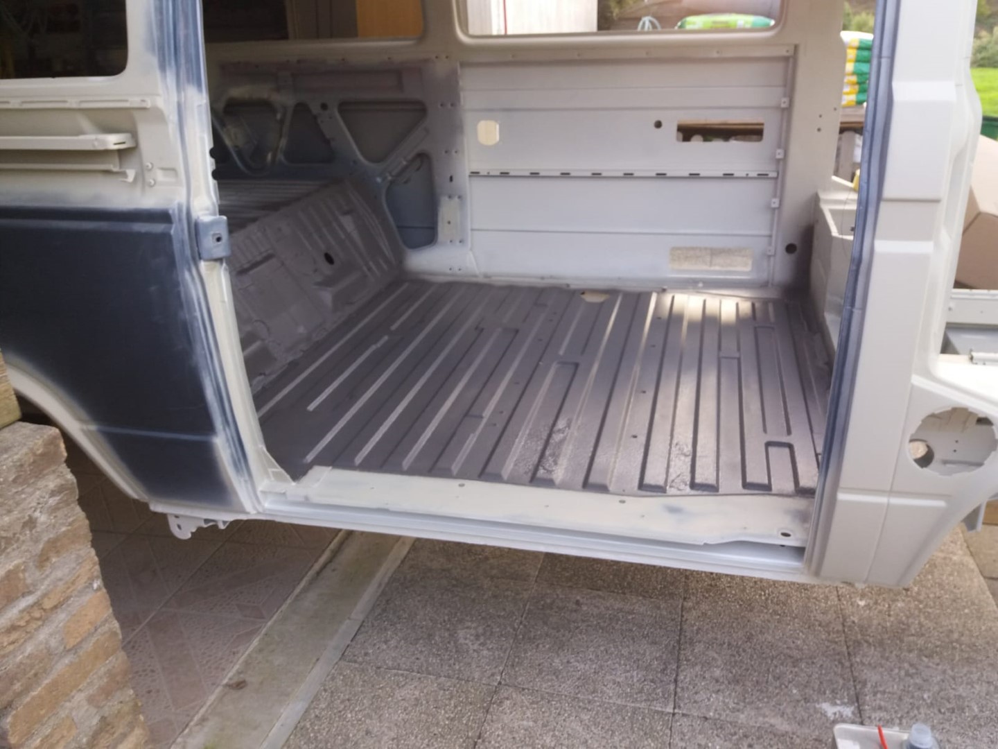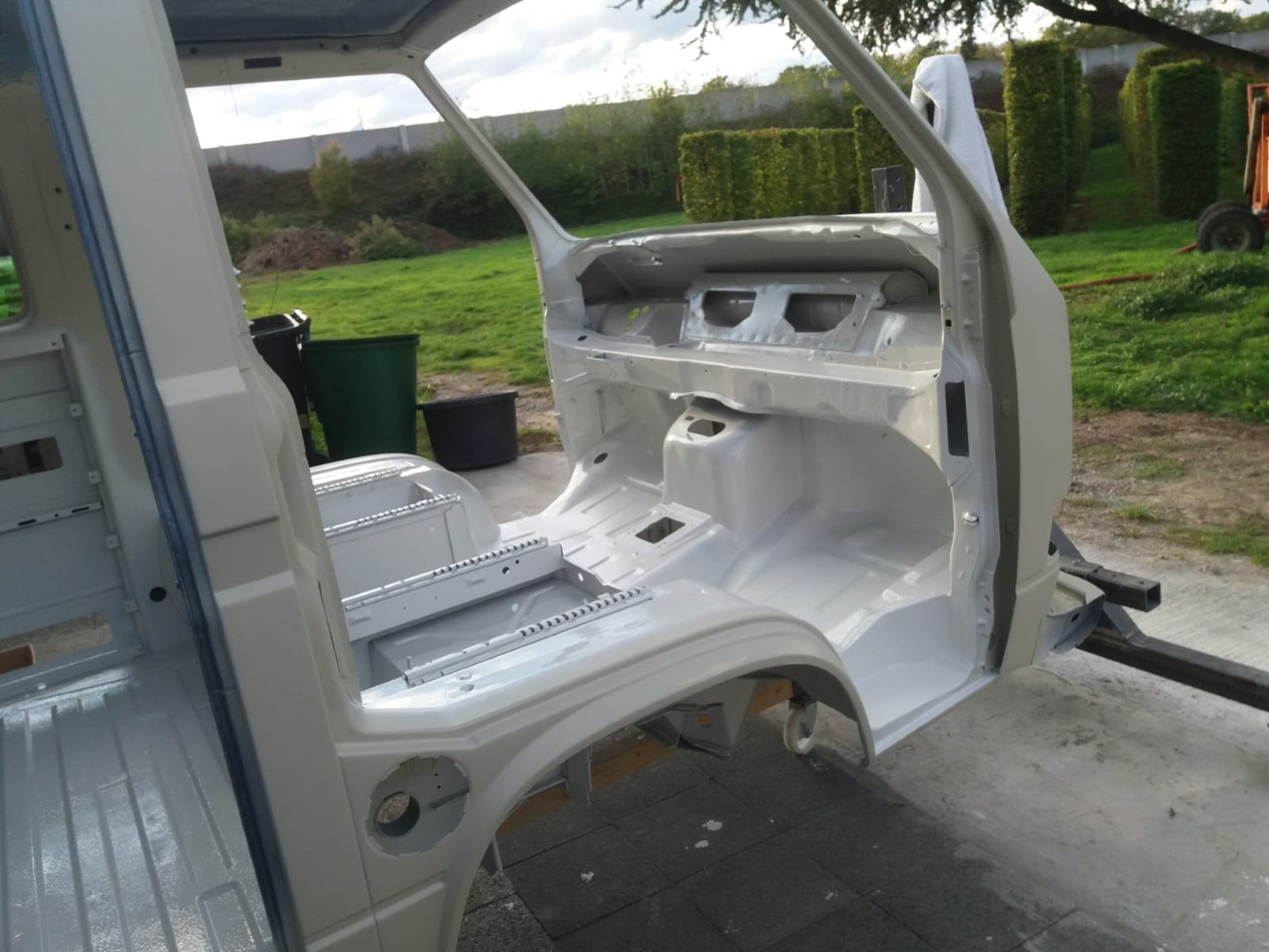 Nach dem unsere Karosse vollständig ausgezogen wurde, soll der Unterboden mit Trockeneis gereinigt werden und der Rost vollkommen verschwinden. Anschließend beginnt der neue Lackaufbau. Mit Blick auf unser Budget wird es wohl keine perfekte Lackierung und wir entscheiden uns soviel wie möglich selbst machen.