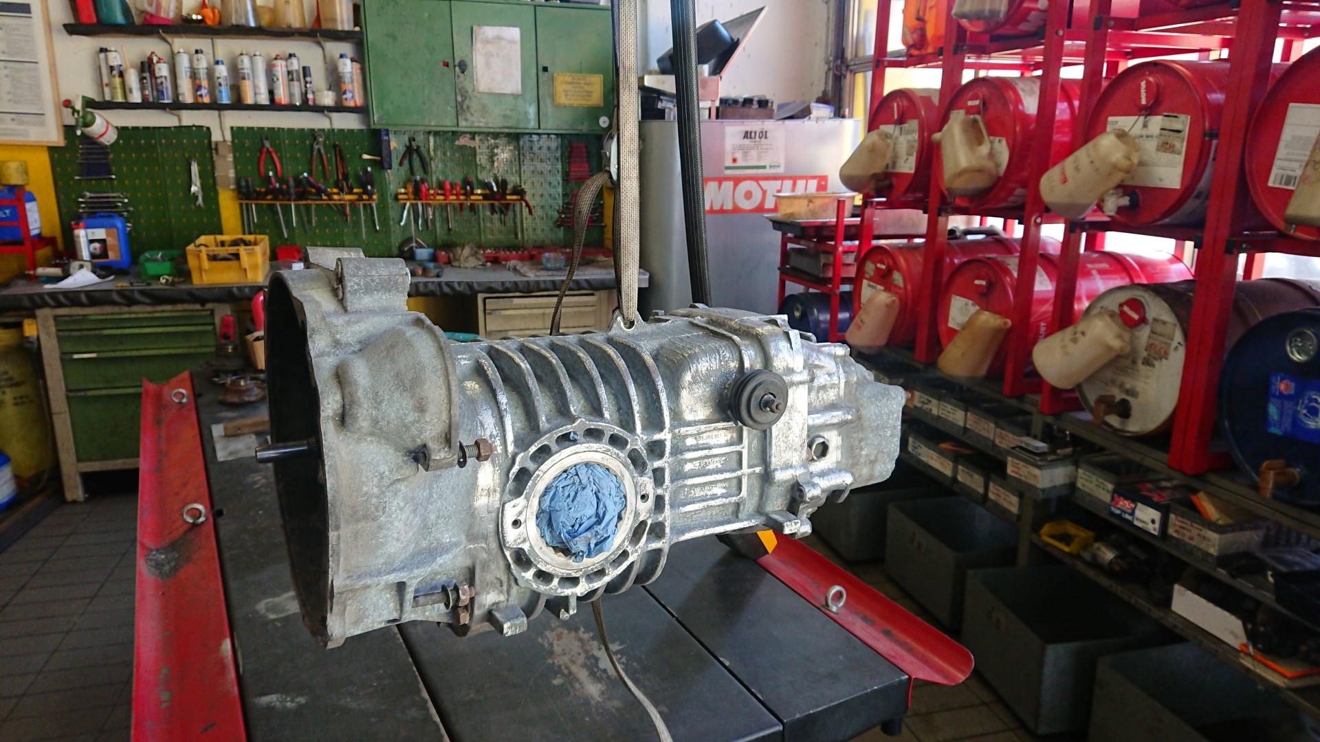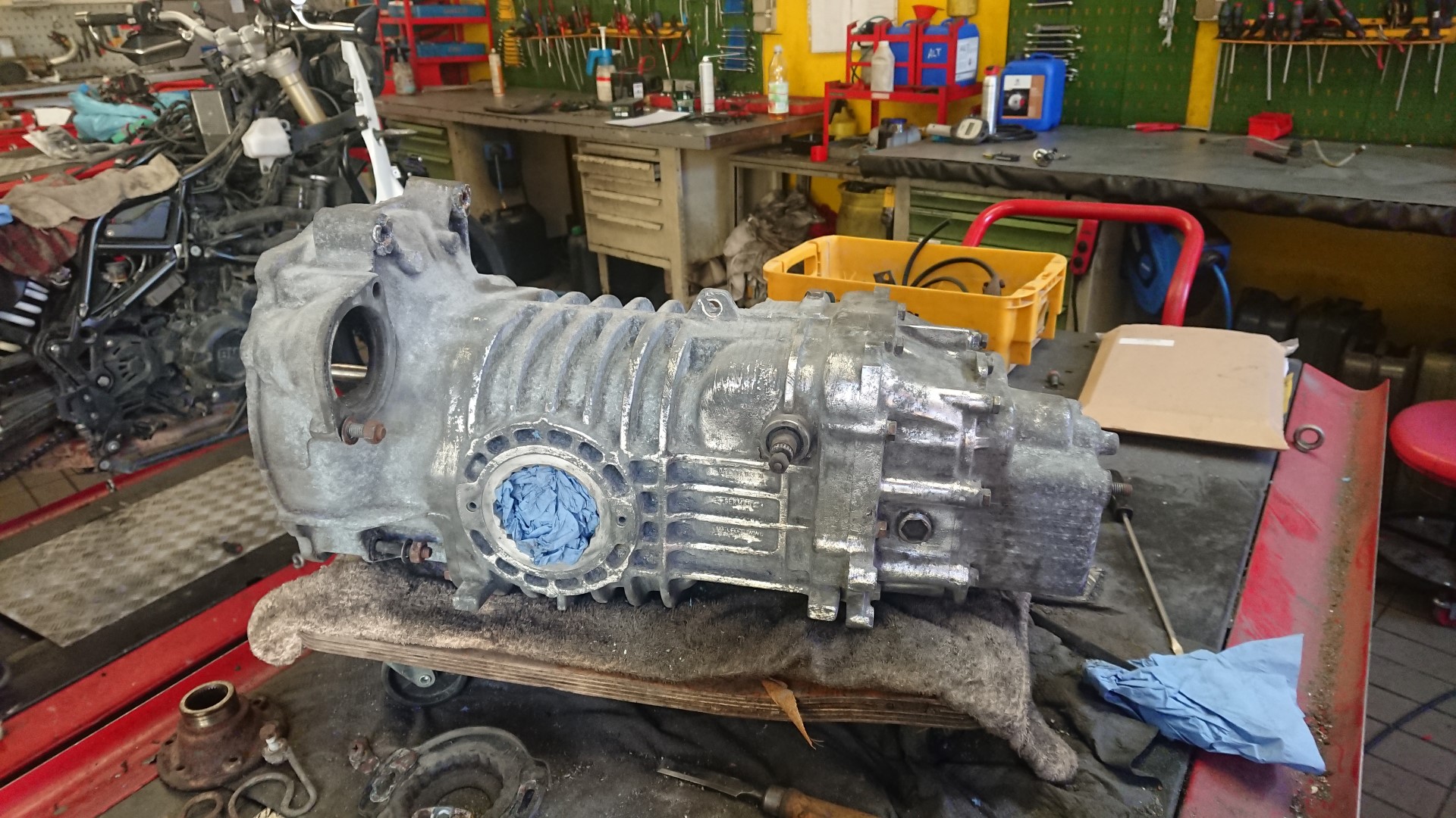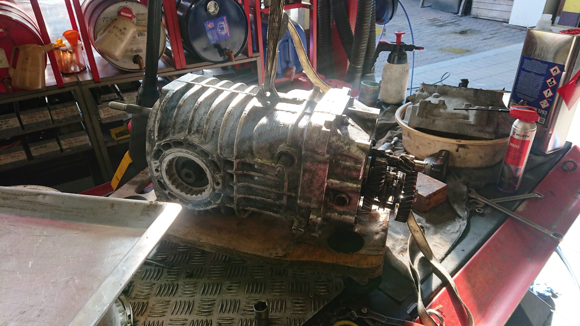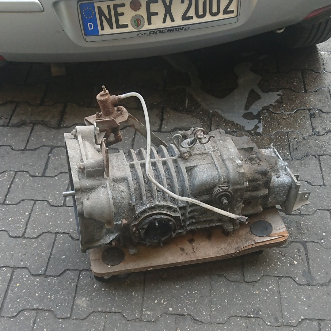 Die Getriebe sind gegenüber dem Motor deutlich weniger anfällig für Schäden und angeblich hat das Getriebe noch keine 100.000 km  gelaufen. Somit entscheiden wir uns dazu bei dem ersten Getriebe, dieses vorerst nur zu reinigen und neu abzudichten. Wir haben schließlich noch ein Austauschgetriebe aus dem „Totalschaden“.