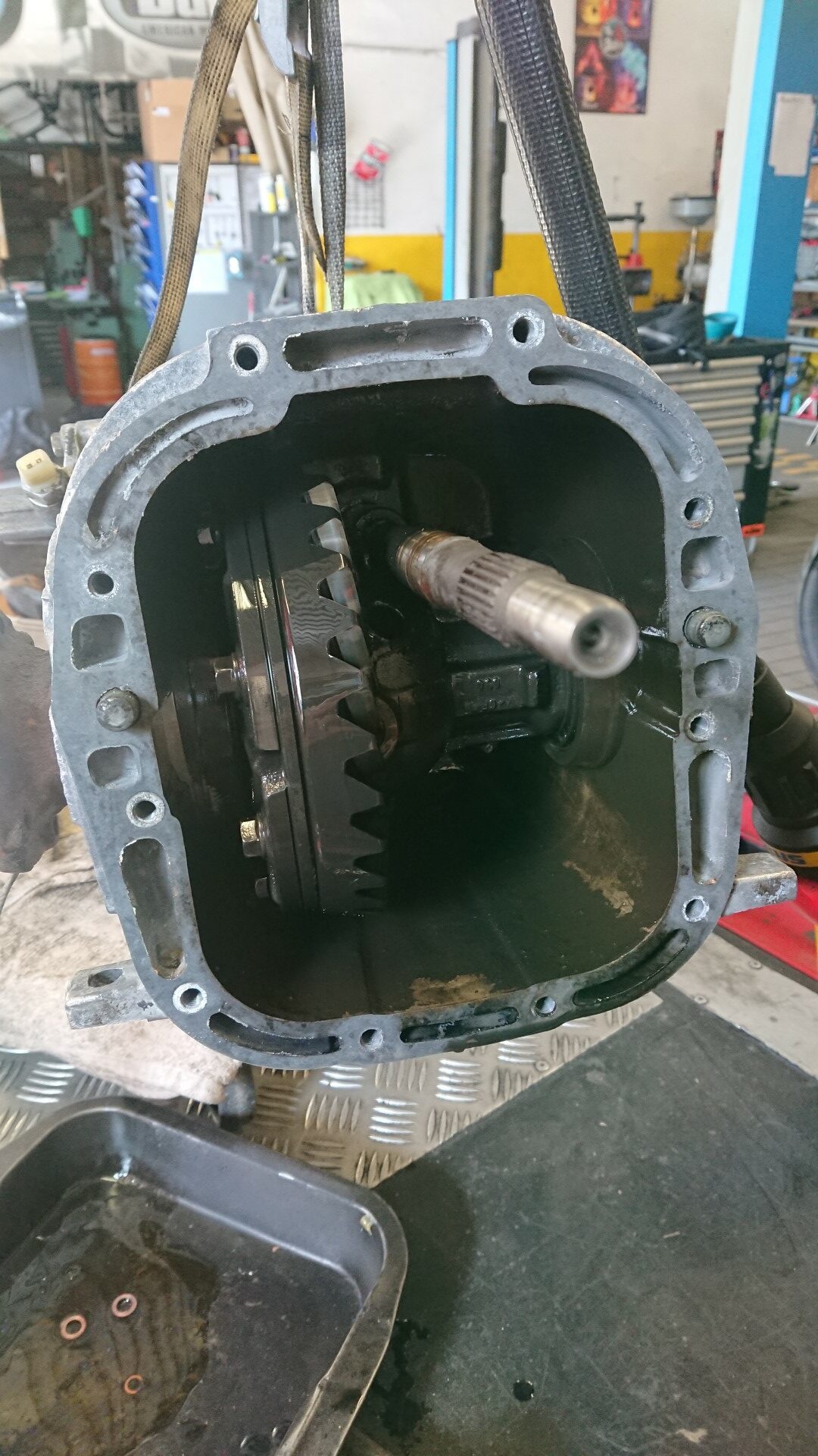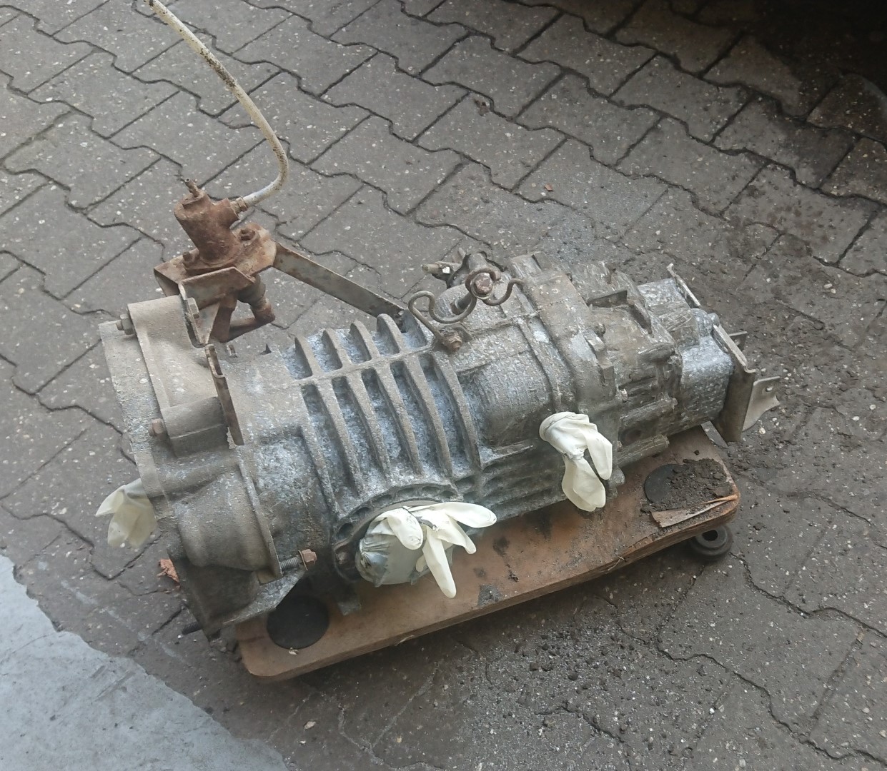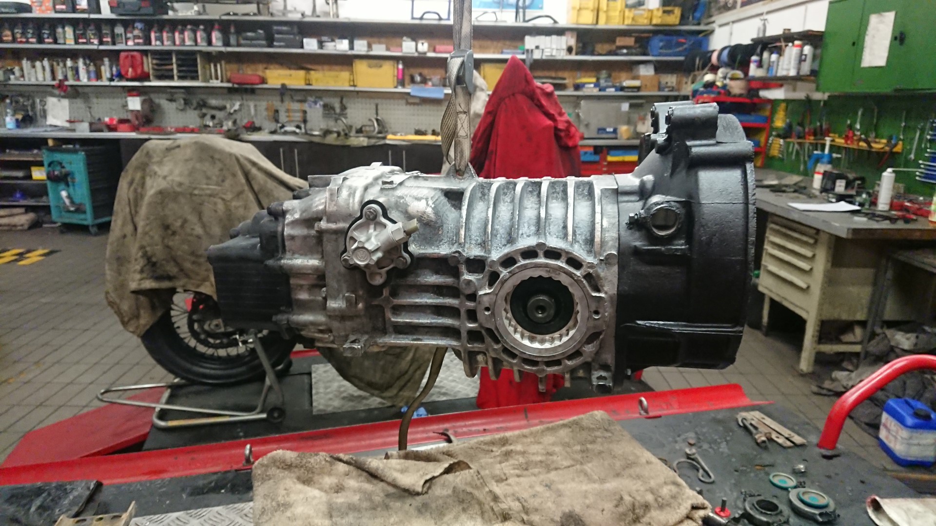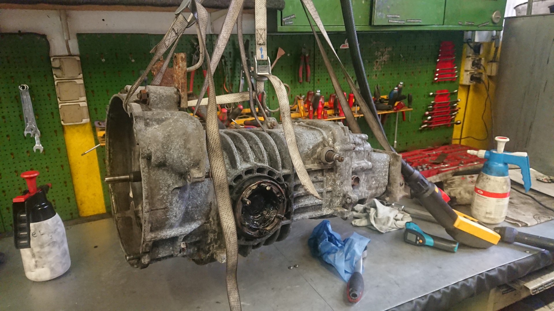 Die Getriebe sind gegenüber dem Motor deutlich weniger anfällig für Schäden und angeblich hat das Getriebe noch keine 100.000 km  gelaufen. Somit entscheiden wir uns dazu bei dem ersten Getriebe, dieses vorerst nur zu reinigen und neu abzudichten. Wir haben schließlich noch ein Austauschgetriebe aus dem „Totalschaden“.
